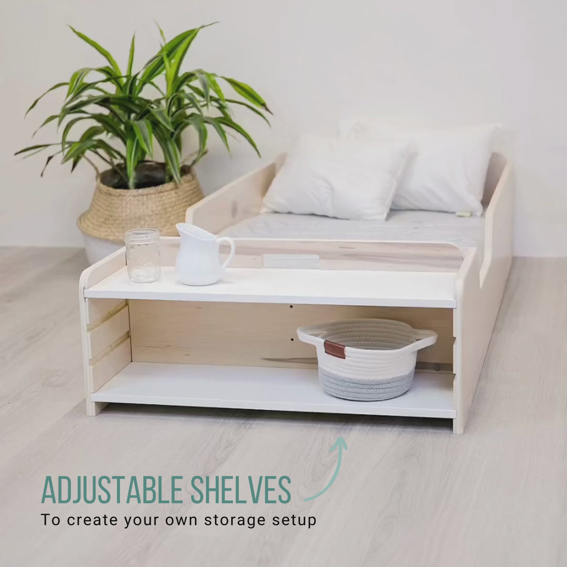 - Étagères personnalisables : réglables sur quatre niveaux différents, vous pouvez créer un coin personnalisé pour les essentiels du coucher, qu'il s'agisse d'un animal en peluche préféré, de livres pour l'heure du coucher, d'une lampe de nuit ou d'une tasse réconfortante.